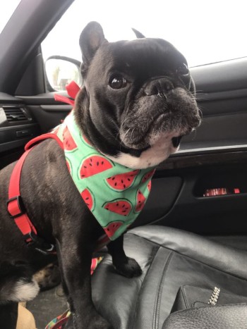 Buldog francuski czarno-białej maści, wykastrowany. W dniu zaginięcia miał na sobie zielono-czerwone szelki z charakterystycznym nadrukiem w arbuzy.