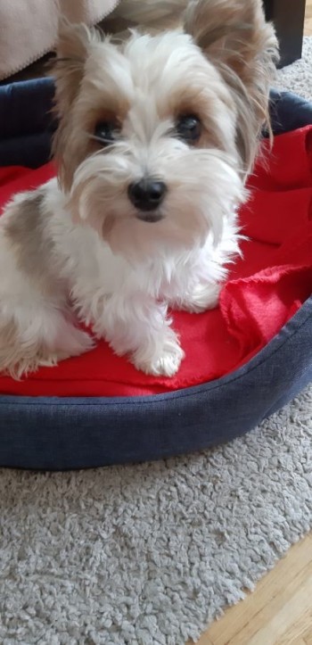 -Imię : Toffik -Biały Piesek -2 kg wagi -Łaty na oczach i uszy w kolorze kawy latte -Sterczące uszy -Strachliwy i Bojaźliwy