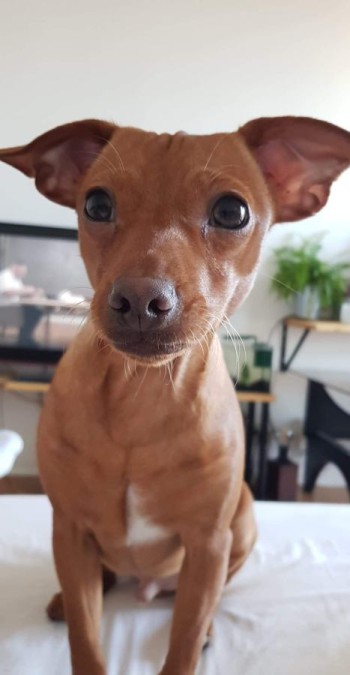 Reks, mały - do połowy łydki rudy piesek.