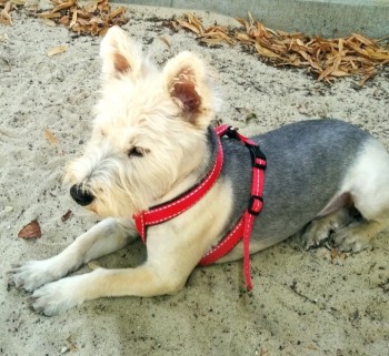 Pies dorosły 10 kg, biały (kremowy) z szarym grzbietem, mieszaniec. Wabi się Odi. Uciekł z terenu posesji, kiedy sąsiad niespodzianie wystrzelił serię petard. Pies nie ma obroży, ma zarejestowanego mikroczipa. Wymaga leczenia weterynaryjnego. Jest lękliwy