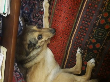 Frida to mieszaniec koloru słomkowego, lat 6, uciekla przed dużym psem, jest lękliwa.