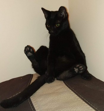 Czarna kocica. Nosi czerwoną obrożę z chustką i dzwoneczkiem. Oraz zawieszką czipa.