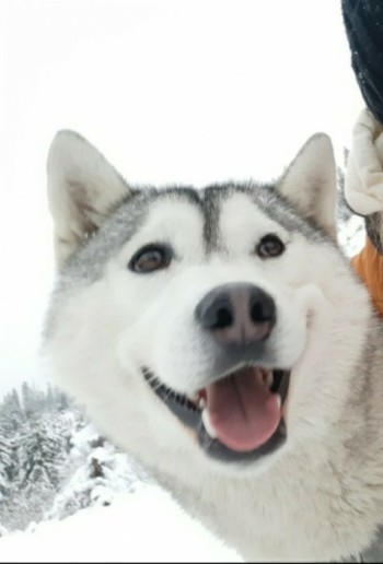 Pies Wabi się Dilajla, ma brązowe oczy, szaro białą sierść oraz biały ogon .