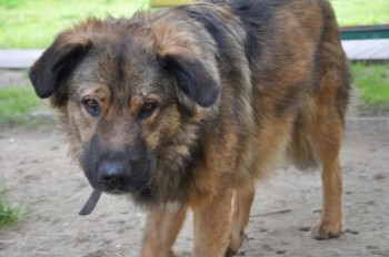 Duży pies.Sierść średniej długości. Brązowy kolor. Uszy oklapnięte. Obroża czarna parciana. Puchaty ogon. W typie owczarka kaukaskiego. Pies błąka się po ulicy.