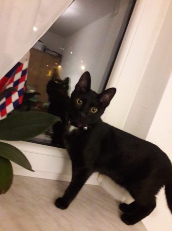 Kotek ma na szyi fioletową obroże z dzwoneczkiem. Jest młody, bardzo ufny i lgnie do dzieci