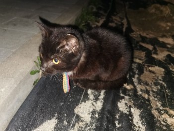 Mały czarny kotek z kolorową obrożą