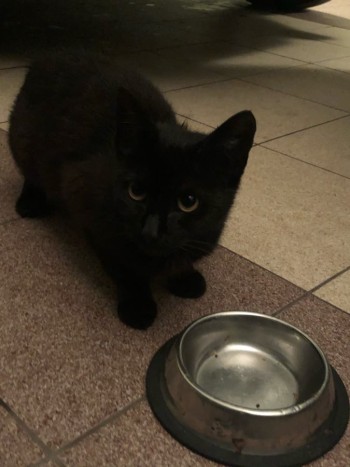 Czarny kotek z małą ilością białego na dole szyi. Przyjazny człowiekowi