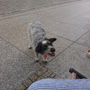 Szaro siwy średniej wielkości z czerwonym sercem na szyji
