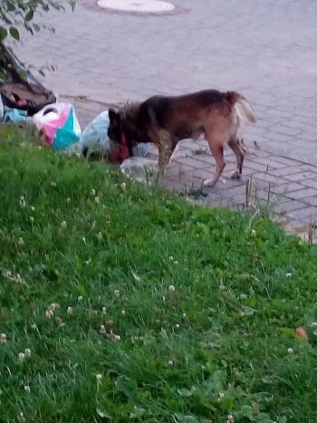 pies z czerwona obrozka wyjada resztki ze smietnika