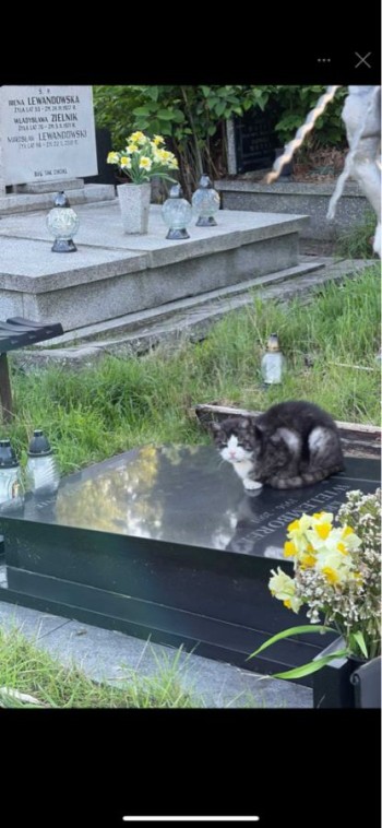 Kotek ma czerwona obrożę, wiszący brzuszek, przebywa na cmentarzu przy manufakturze.