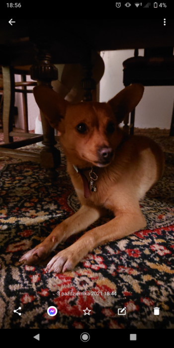 Bardzo ufna. Wchodzi do domu. Ma urwane zapięcie, breloczek i bandamkę.