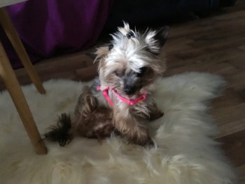 Piesek drobny wyglada na starszego grzywa jasna reszta szara wystający kiellek