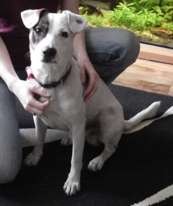 Średniej wielkości piesek biały z łatą na głowie. Proszę o pilny kontakt właściciela - piesek tęskni.