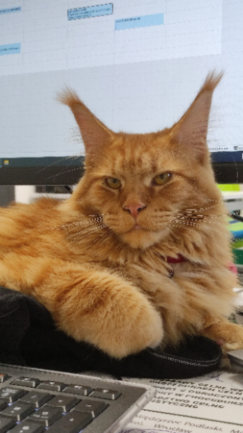 duża, ruda kotka, ok 7kg, ponad 1 m długości z ogonem; niecały rok, łagodna