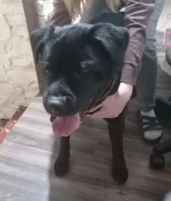 Czarny samiec w typie amstaffa, zadbany. Z brązowa, skórzaną obrożą bez adresatki.