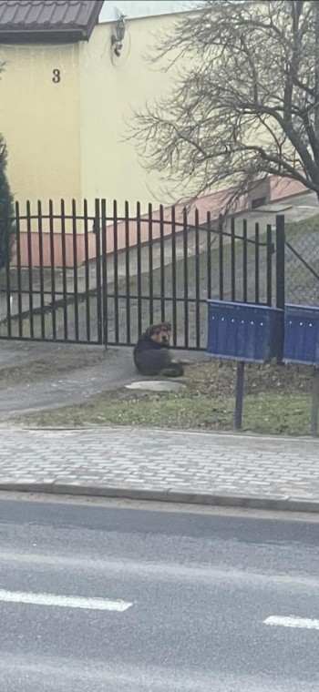 Duży pies, Czarno-brązowej maści. Przestraszony, boi się dotyku. Lekko wychudzony, chyba błąka się już kilka dni.