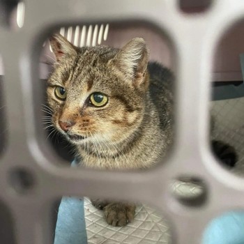 Bura kotka, drobna, wystraszona, jeden kieł, usunięte zęby, była niewysterylizowana