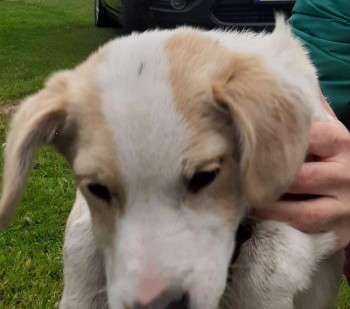 Znaleźliśmy białą suczkę , szczeniaczka, z jasnymi rudymi uszkami i plamkami na grzbiecie. Jest bardzo przyjazna
