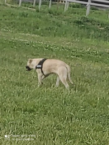 duży pies o szaromlecznej maści z czarnymi szelkami