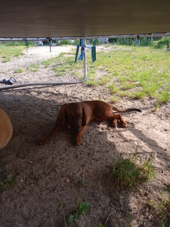 Brązowa młoda suczka z białym krawacikiem obroża czarna w białe kosteczki.