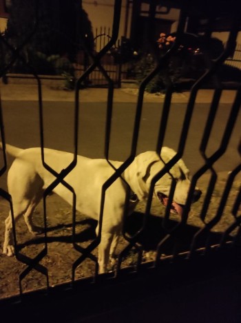 Jasny duży pies z czarną obroża , Łagodny w kontakcie , widać , że komuś uciekł .