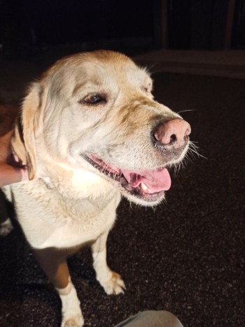Spokojny i łagodny. Ma na szyi obrożę, która kiedyś świeciła. Na przycisku jest napis Baldo.