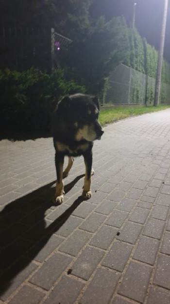 Czarny kundelek z krótkim ogonem,wysokość do kolana. starszy psiak