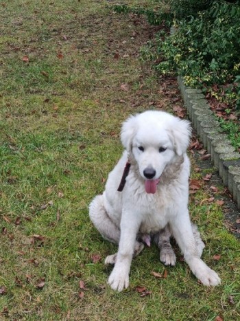 Młody biały pies dużej rasy, podobny do owczarka podhalańskiego. Ma obrożę ale bez żadnej adresówki.