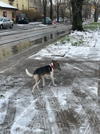 Piesek średniej wielkości nieco podobny do Harta z kagańcem i obrożą, bez Zawieszki z imieniem itp.