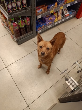 Rudy pies, średniej wielkości, czerwona obroża