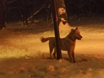 umaszczenie biało żółte, pies duży, szczupły. nie jestem pewna płci. płochliwy i spokojny
