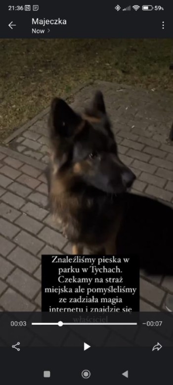 Zadbany owczarek niemiecki, kręcił się po parku północnym w Tychach (trzy stawy). Grzeczny i przyjazny, reagował na niektóre komendy typu siad itd. Udało nam się go utrzymać przy sobie do momentu przyjazdu straży miejskiej, ale potem się przestraszył i uciekł. Nie miał obroży