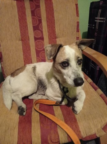 Młody wesoły piesek błąkał się od Sylwestra, biały z jasno brązowymi łatkami, przyjazny, na kolankowy. Obecnie przebywa w Schronisku Rafik w Bolesławiu koło Olkusza