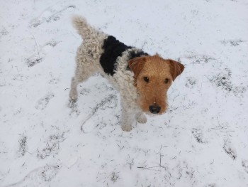 Pies ma czerwoną obrożę, nie boi się ludzi nawet daje łapę.