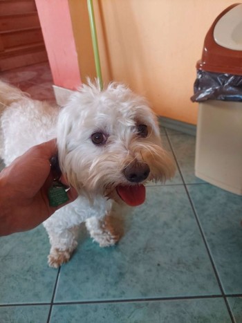 Pies ma na sobie niebieską obrożę z zielonym brelokiem