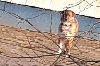 Szaro-bury ,białe łapki i biały krawat,wysokość do kolan