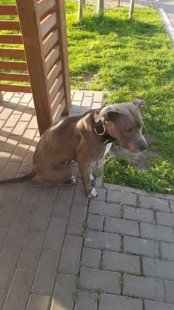 Suczka pittbul kolor szaro-brązowy, obroża czarna z różowym napisem Bella. Kręci się nad zalewem Skierniewice w okolicy ul. Miodowej.