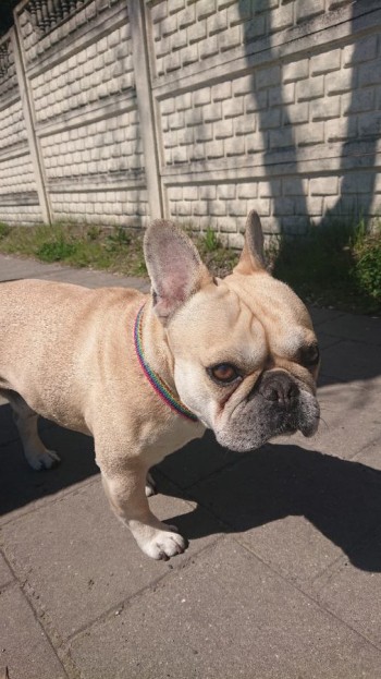 Jasno kremowy z obrożą chyba czerwono niebieską