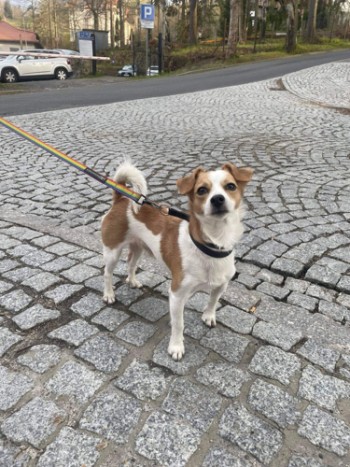 Piesek ma obroże, chyba wybiegł ze szlaku czerwonego/niebieskiego