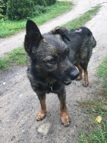 Maly piesek, przyjazny i chodzi za ludzmi. Ma zolta zaruwiasta obroze, brazowe oczy.
