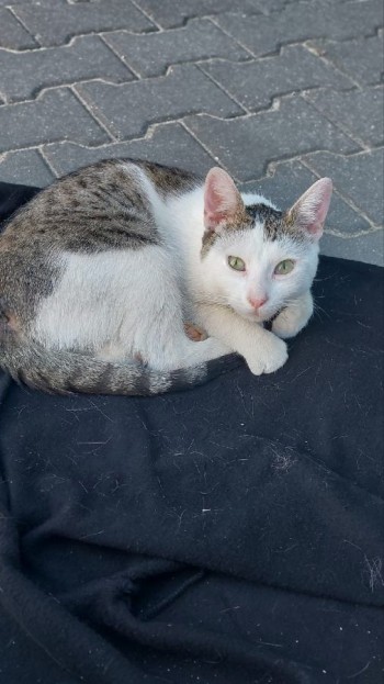 Młody kocurek, biało-szary, oswojony, łasi się do ludzi.