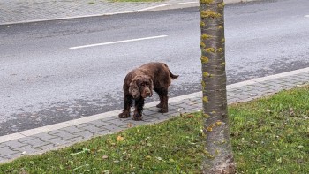 Czekoladowy spaniel, samiec. Dobrze odżywiony, ale z niezadbaną sierścią na łapach. Nieagresywny. Nie jest też lękliwy.