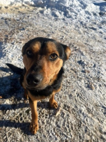 Pies jest nieduży. Sierść jest w kolorze czarno-beżowym.