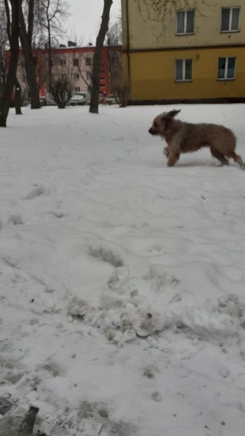 sredniej wielkości,jasny, długowłosy, z obroża i fragmentem smyczy
