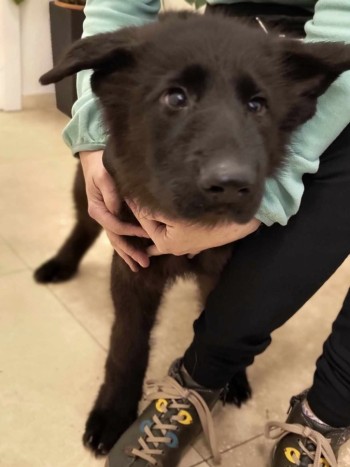Szczeniak, cały czarny. Ok 3-4 miesiace. Miał szelki i przypinkę gabinetu Vis Vitalis w Stargardzie