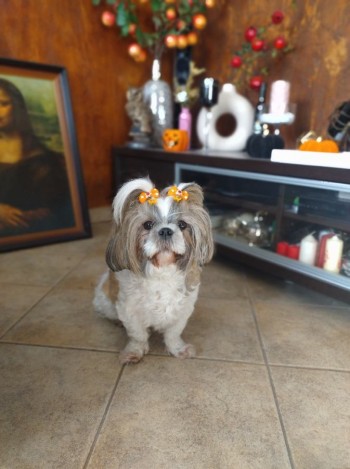 biało brązowa samiczka troszke uszka czarne zawsze uczesana w kokardki