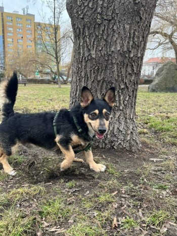 Czarny z wierzchu, jasny od spodu, średnich rozmiarów, zielone szelki.