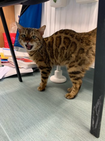 Kot w typie kota bengalskiego, bardzo zadbany, zielone oczka, cętki. Bardzo przyjazny. Głośno i dużo miauczy. Najprawdopodobniej samiczka, ale pewności nie mamy.