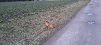 Piesek mały, młody i przyjazny. Ma czerwoną obrożę.
