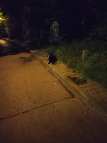 Czarny, otyły kundelek, bez obroży, trudno zgadnąć płeć. Nie pozwala do siebie podejść. Schronisko powiadomione - ktoś po niego przyjedzie.